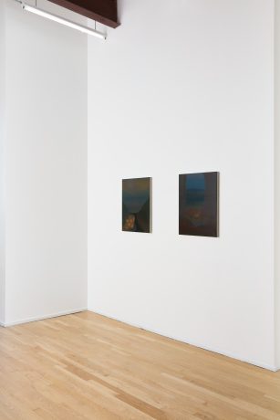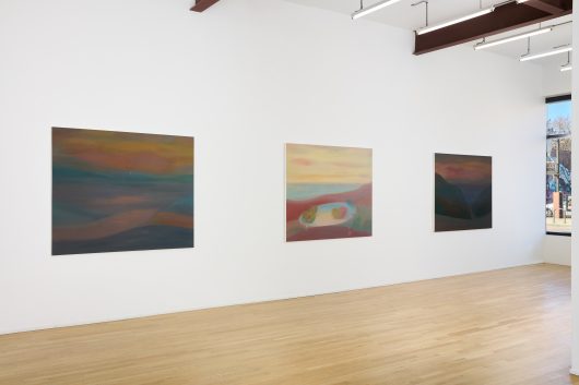 In Songs of the Marauder, Michelle Wasson’s paintings depict distant terrains and unfold with a slow, resonant cadence, articulated through twilight palettes of dusky pinks, smoldering oranges, and deepening blue hues. Her works function as meditative landscapes, where curved horizons dissolve into sealed oases, and doorways or portals suggest passages toward refuge and escape. Rendered through luminous, softly dissolving color, the paintings appear haunted by temporal residue, as though bearing fragments of previous occupation. For Wasson, each work—like a song—hovers between melancholy and hope, simultaneously gesturing toward the future and acknowledging humanity’s cyclical patterns of destruction and renewal.