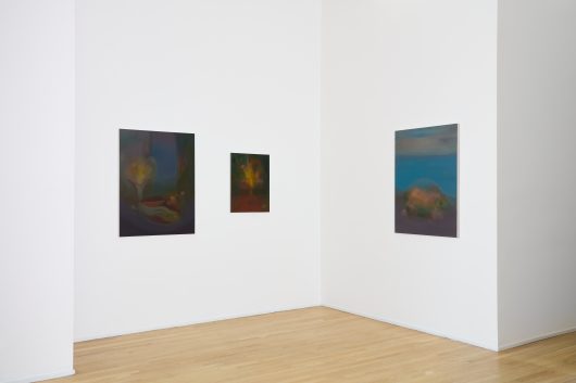 Wasson engages obliquely with the historical traditions of floral still life and landscape painting, drawing from their legacies without reproducing their formal or ideological constraints. Through an abstracted, oneiric visual language, her imagery loosens attachment to specific places or notions of possession. She subtly weaves references to the female body, another site embedded with its own personal histories and emotional topographies, into other formal elements of her landscapes. Two mounds could be parting legs, a horizontal gesture, a resting body. Vegetal forms operate as emotional registers rather than fixed symbols.