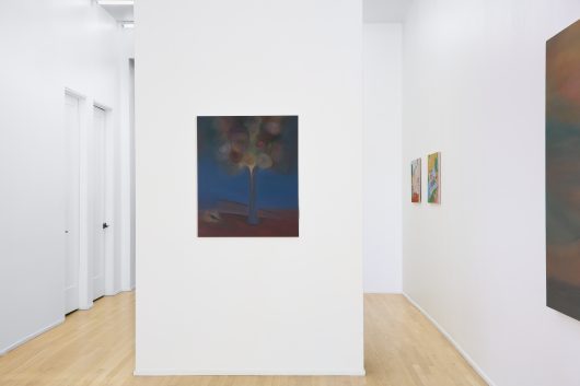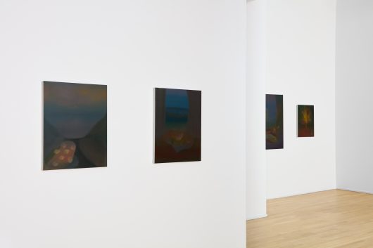 Having worked across painting and printmaking throughout her career, Wasson’s return to oil marks a shift toward a more deliberate and reflective mode of production. The medium’s temporal demands encourage prolonged engagement, allowing form and color to accumulate gradually and generate depth and tonal complexity. The move toward darker chromatic ranges recalibrates the works’ emotional register, intensifying their atmospheric resonance. Oscillating between abstraction and figuration, these paintings subtly echo the sensibilities of artists such as Agnes Pelton, Georgia O’Keeffe, Leonora Carrington, and Remedios Varo. Rather than referencing their subject matter directly, Wasson draws from their attentiveness to light and mood, treating color as an experiential force that shapes perception through affect rather than description.