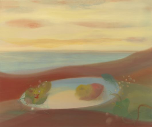 Wasson engages obliquely with the historical traditions of floral still life and landscape painting, drawing from their legacies without reproducing their formal or ideological constraints. Through an abstracted, oneiric visual language, her imagery loosens attachment to specific places or notions of possession. She subtly weaves references to the female body, another site embedded with its own personal histories and emotional topographies, into other formal elements of her landscapes. Two mounds could be parting legs, a horizontal gesture, a resting body. Vegetal forms operate as emotional registers rather than fixed symbols.