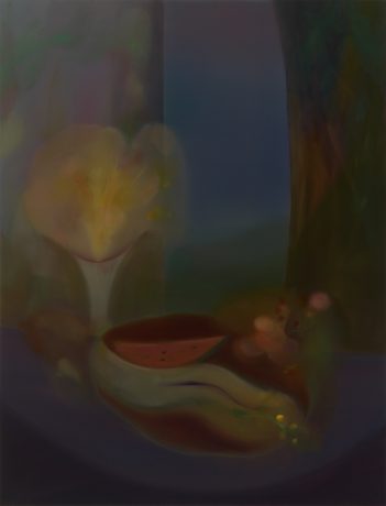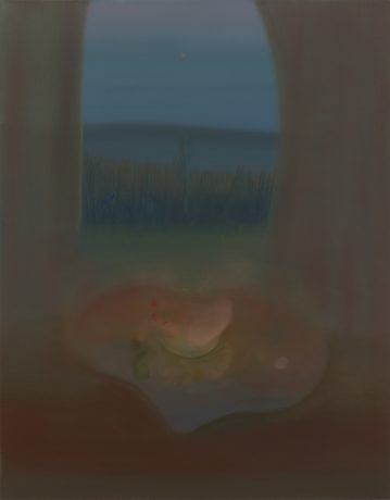 Having worked across painting and printmaking throughout her career, Wasson’s return to oil marks a shift toward a more deliberate and reflective mode of production. The medium’s temporal demands encourage prolonged engagement, allowing form and color to accumulate gradually and generate depth and tonal complexity. The move toward darker chromatic ranges recalibrates the works’ emotional register, intensifying their atmospheric resonance. Oscillating between abstraction and figuration, these paintings subtly echo the sensibilities of artists such as Agnes Pelton, Georgia O’Keeffe, Leonora Carrington, and Remedios Varo. Rather than referencing their subject matter directly, Wasson draws from their attentiveness to light and mood, treating color as an experiential force that shapes perception through affect rather than description.