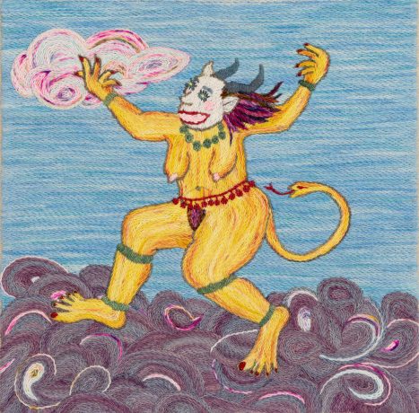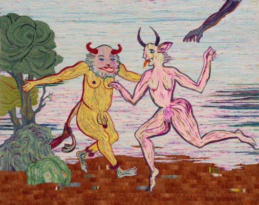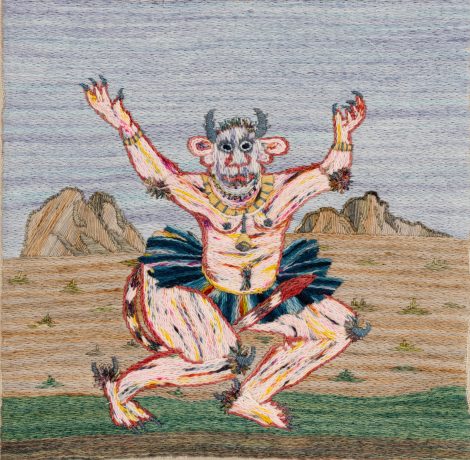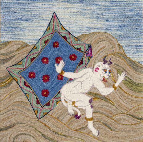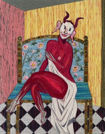 Kayoud’s intricate and colorful embroidered paintings transport figures and narratives from mythology into intimate, contemporary and decidedly positive human-centric settings. The works in this exhibition concentrate on the div, a demon-like creature depicted in Middle Eastern mythology and likely of Persian origin. Traditionally portrayed as monstrous or threatening, Kayoud reimagines these mythological beings as familiar, gentle, and emotionally present. Through embroidery, a medium historically associated with care, patience, and domestic labor, she softens and humanize these figures, inviting viewers to encounter them without fear.